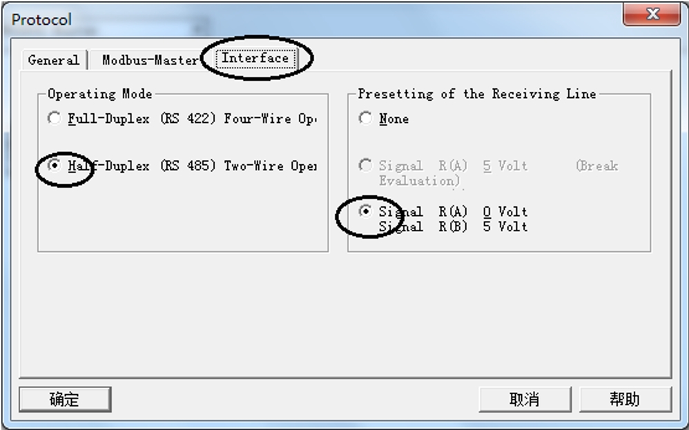 6、點擊“Interface”按鈕,進(jìn)入RS485通訊模式畫面。點擊確定,返回參數(shù)設(shè)置對話框,點擊“保存”保存所修改參數(shù)。如上圖點選:半雙工、A-/B。
