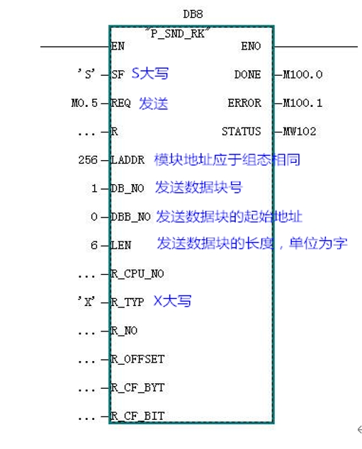 網(wǎng)絡(luò)3:點擊“庫”>>CP PtP >> CP341>>FB8,調(diào)用FB8模塊,并創(chuàng)建背景數(shù)據(jù)庫DB8,如下圖設(shè)置各管腳參數(shù)。參數(shù)說明如下表