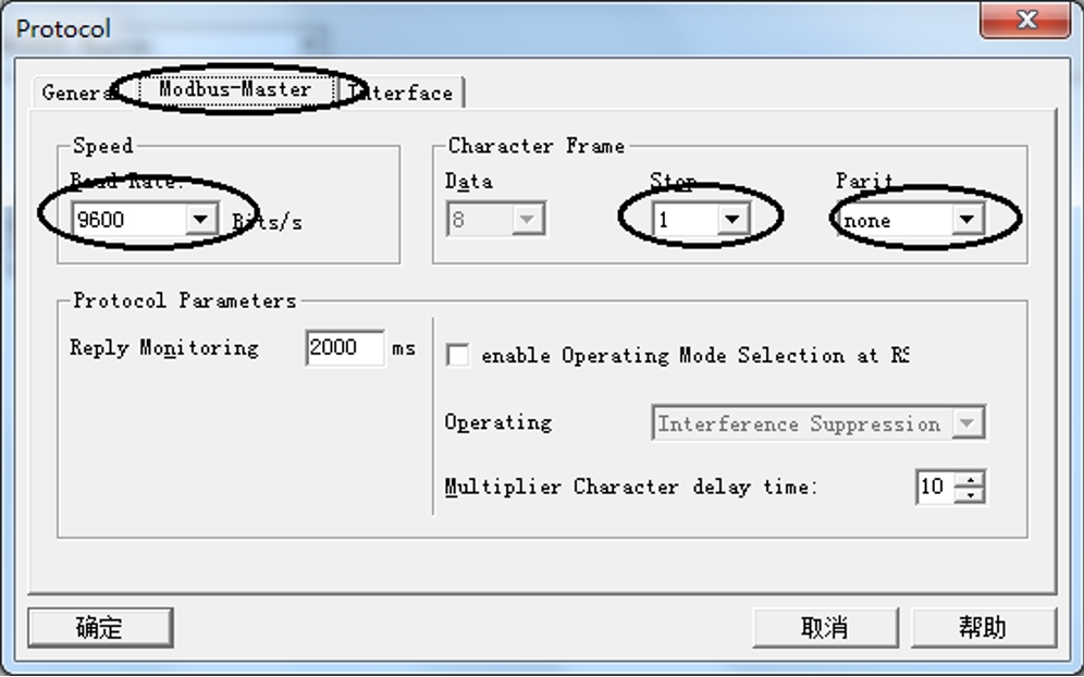 6、點擊“Interface”按鈕,進(jìn)入RS485通訊模式畫面。點擊確定,返回參數(shù)設(shè)置對話框,點擊“保存”保存所修改參數(shù)。如上圖點選:半雙工、A-/B。